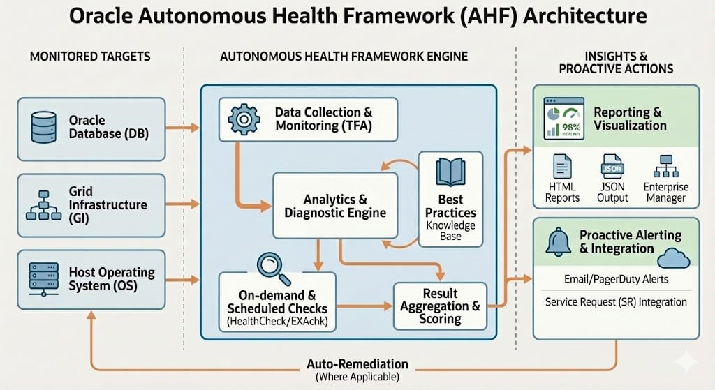 Oracle Autonomous Health Framework (AHF) presents the next generation of an all-in-one solution that includes tools that work together autonomously 24×7 to keep database systems healthy and running. It does so while minimizing human reaction time using existing components like orachk, TFA and many more.