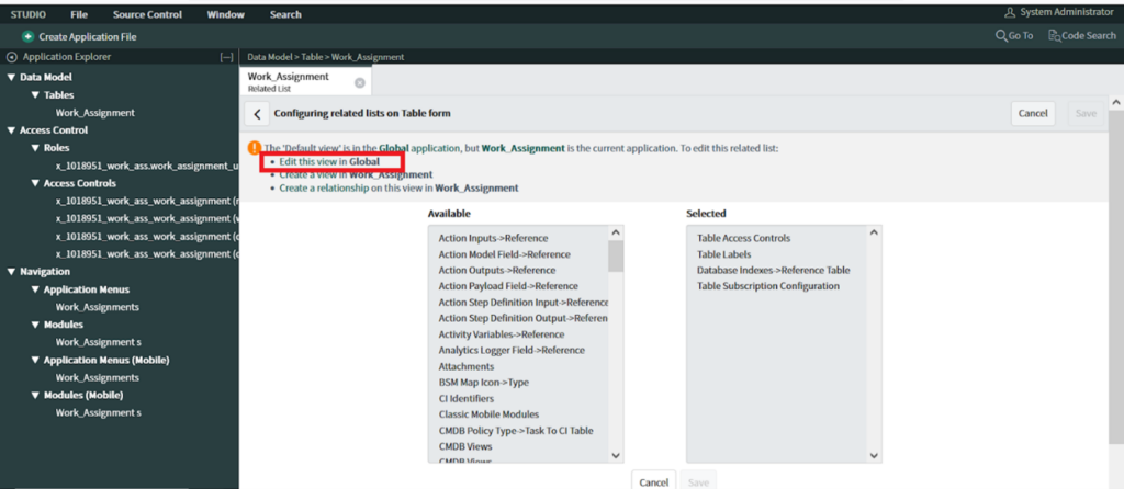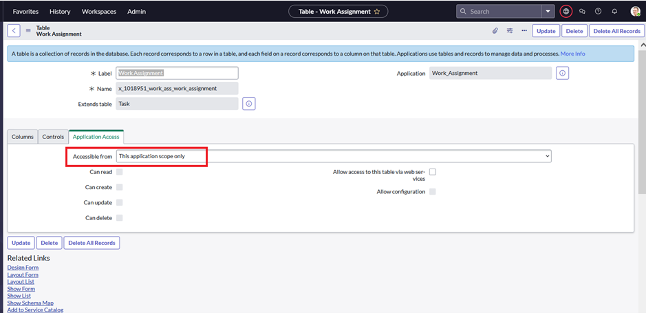 Restrict design time access to table outside application scope