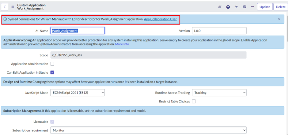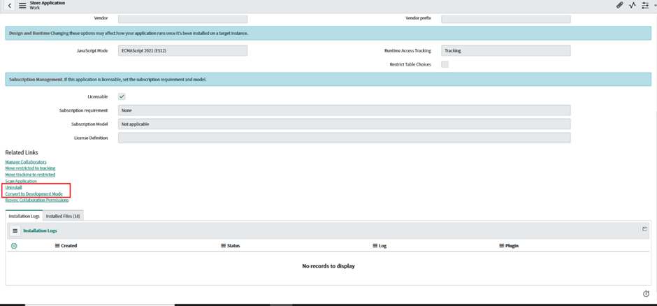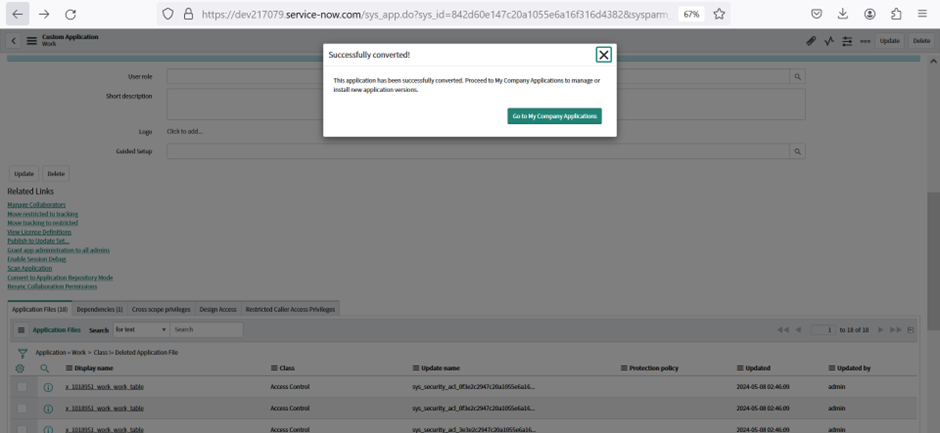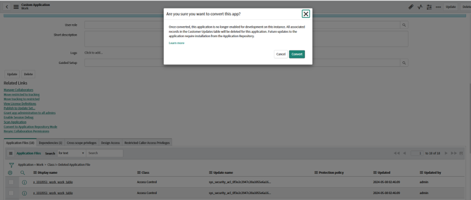 After you convert the application, it is no longer enabled for development on the instance where the conversion is performed. For a scoped custom application, all associated records in the Customer Updates table are deleted for this application.