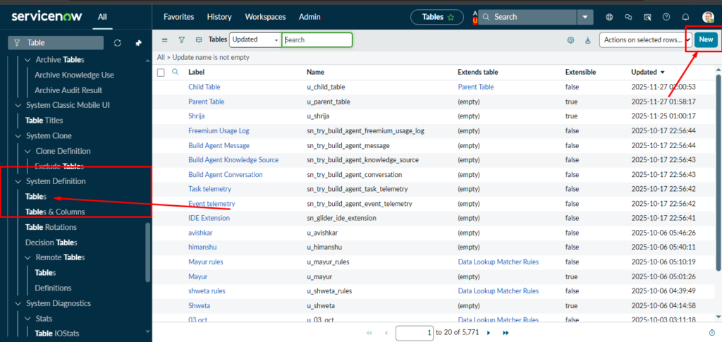 - Search Tables in Navigation Bar to Make Tables & Click on New.
