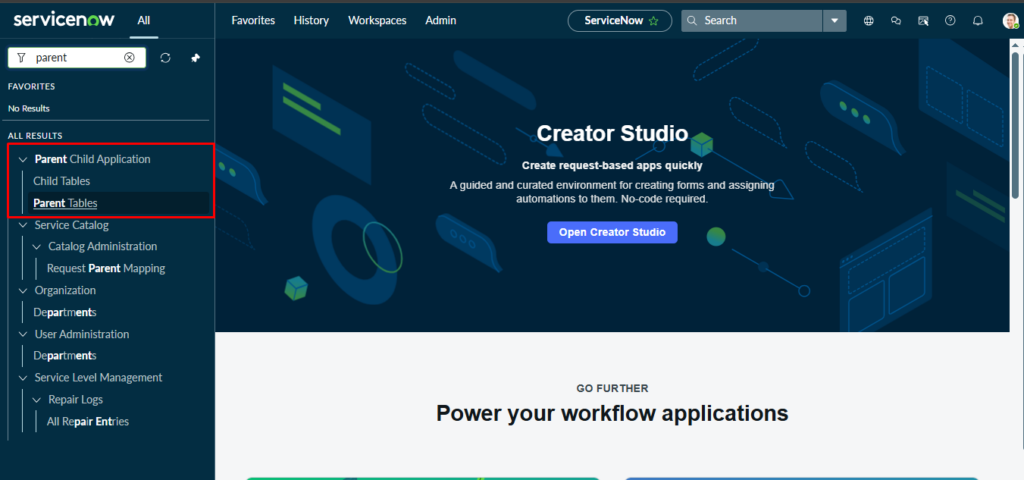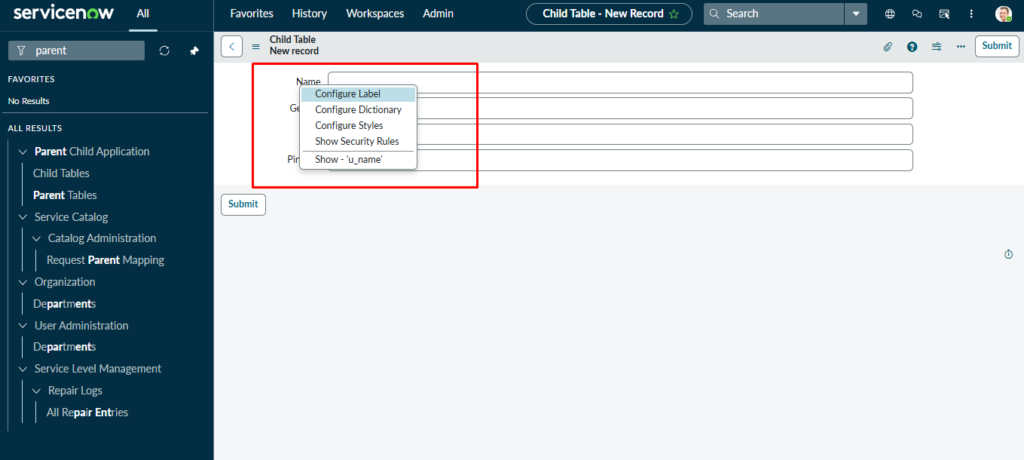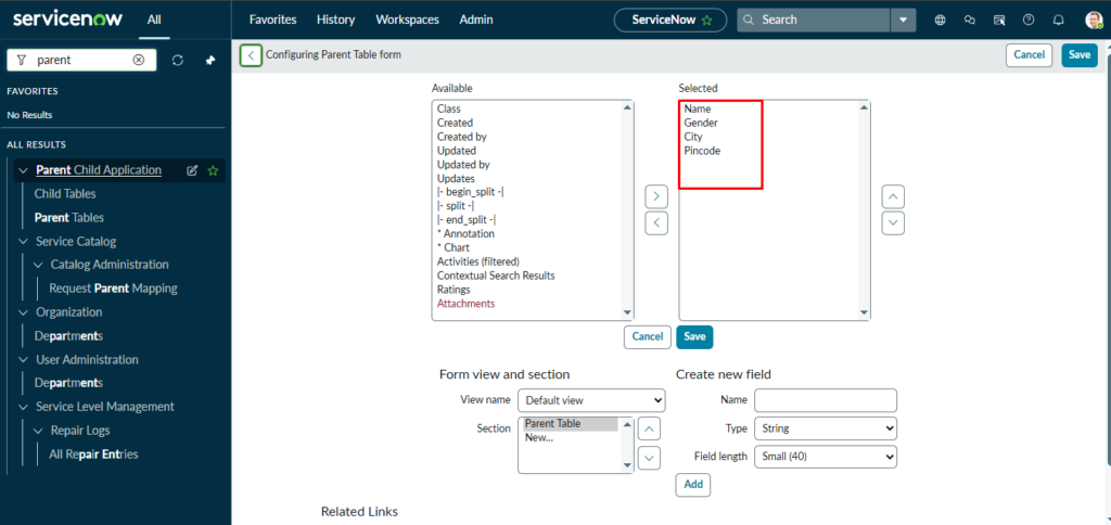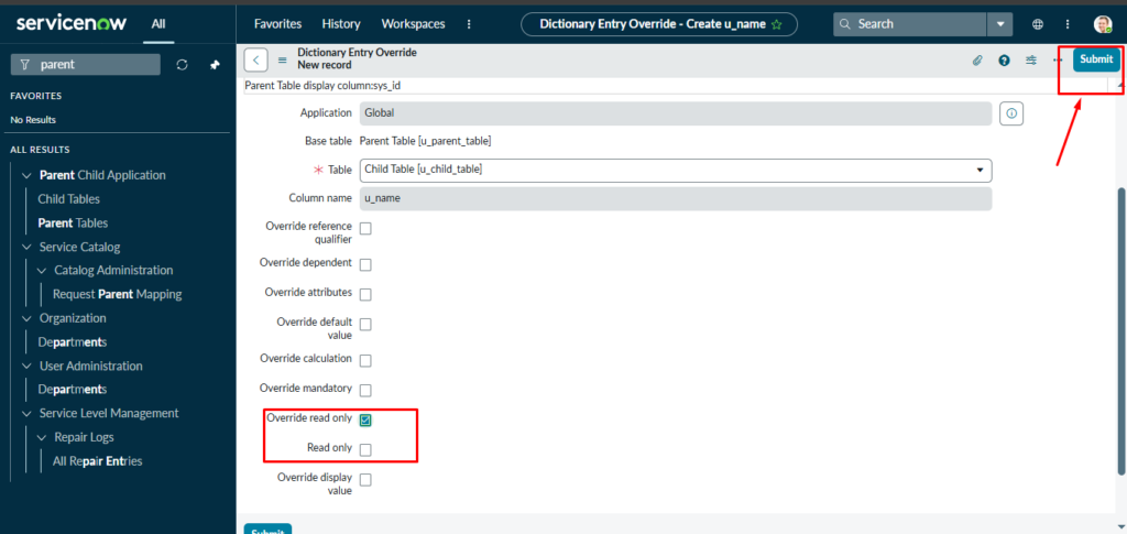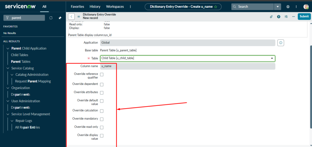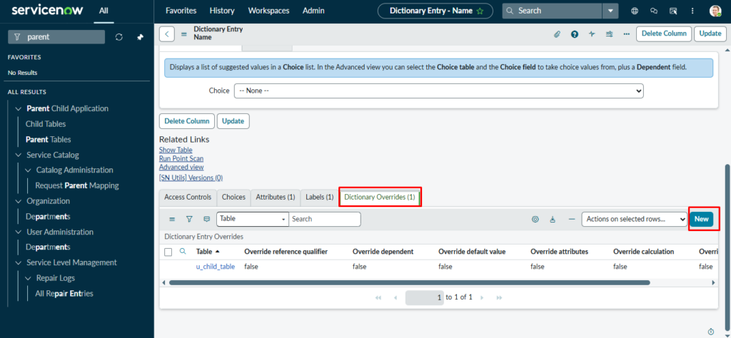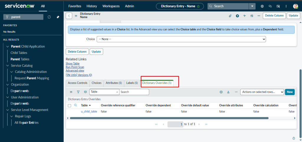 - Search tables for Parent & Child Tables in Navigation Bar, Perform Dictionary Override.