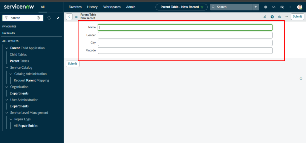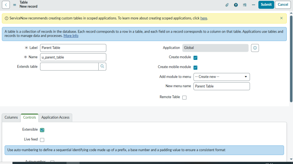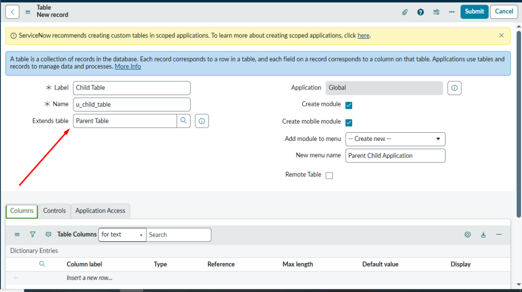 - Now go to table for Making Child Tables in that Add Table Name, In Extends Table Give Name of parent Table to Make this table a child table & submit it.