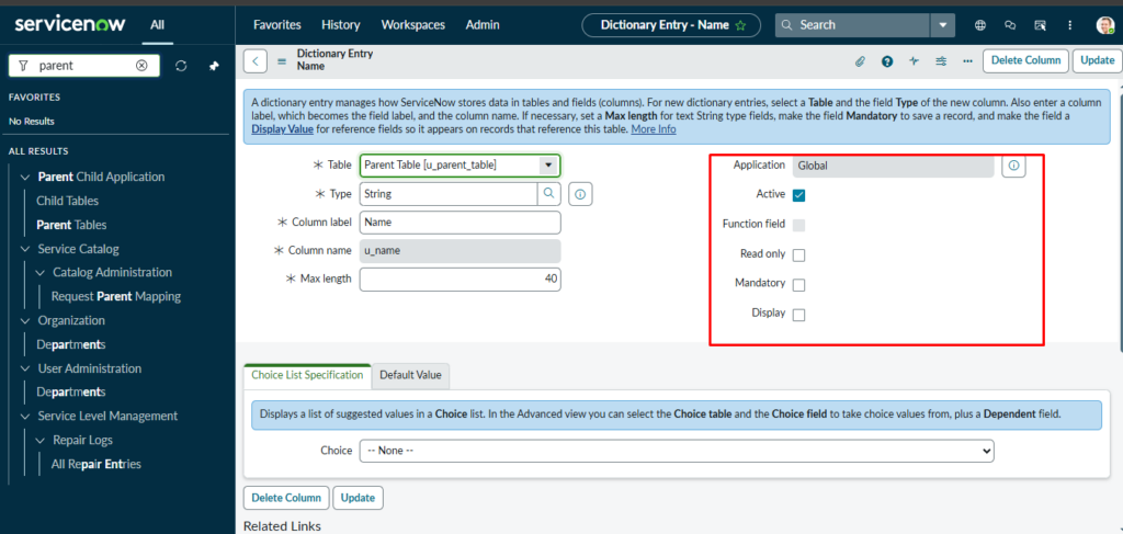 - Go to child Table->Right click on Name->Configure Dictionary->