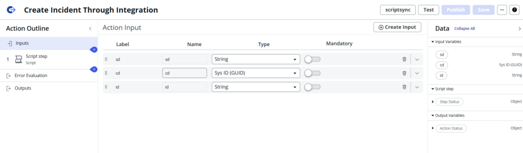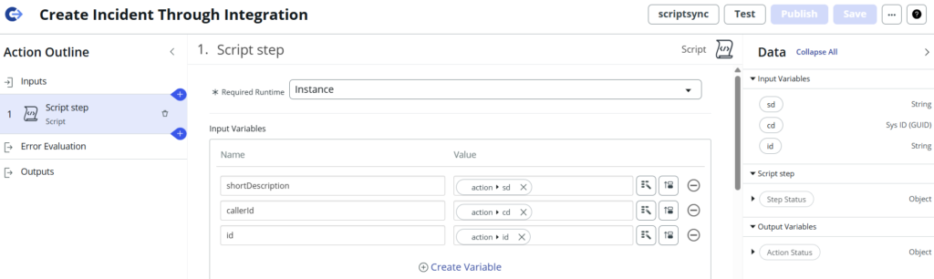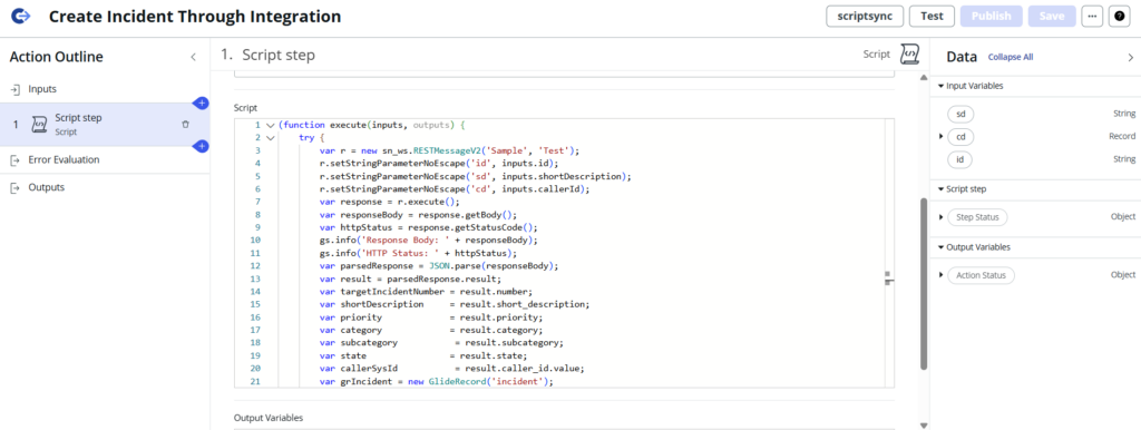 • inputs → values passed from Flow (incident sys_id, short description, caller)