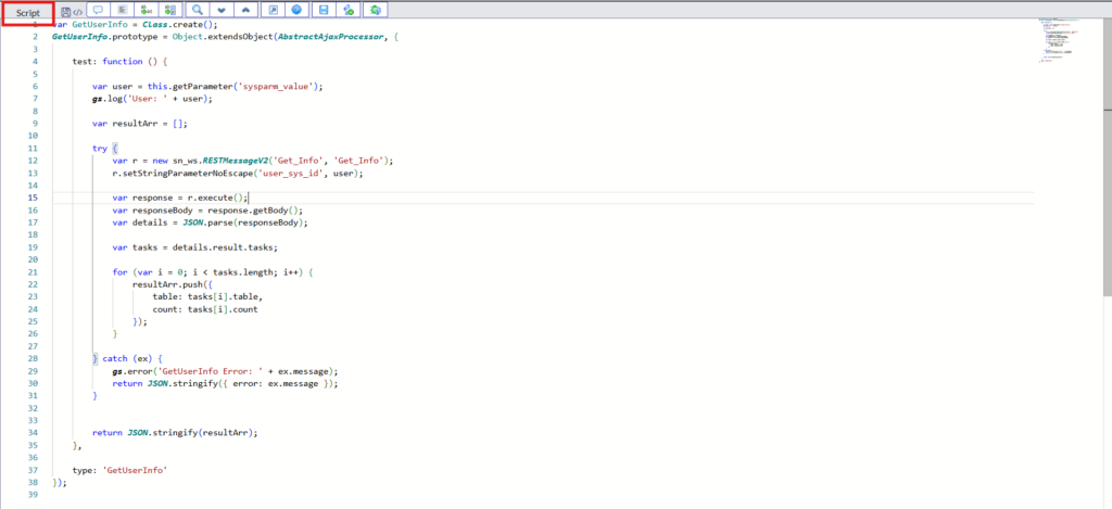 This script will fetch the user that is selected on the catalog item, calls the REST message we have created in instance A, and whatever response we get from instance B, script will fetch assignment details for the user.