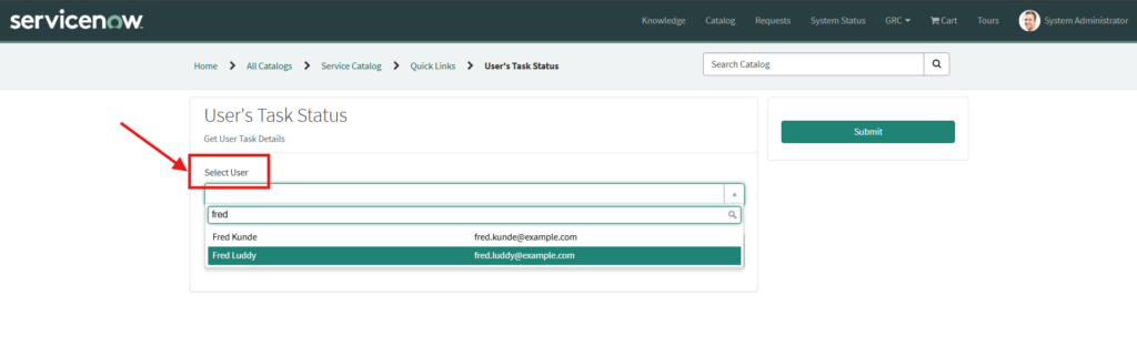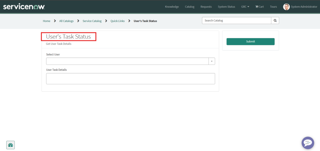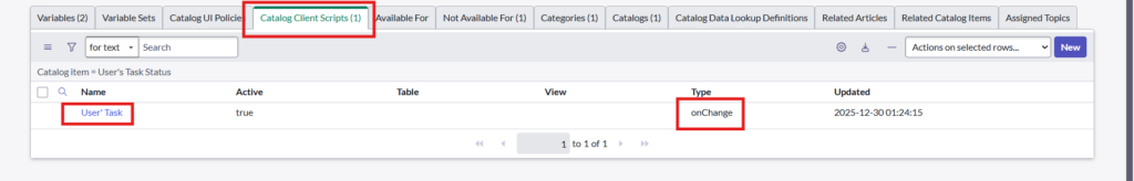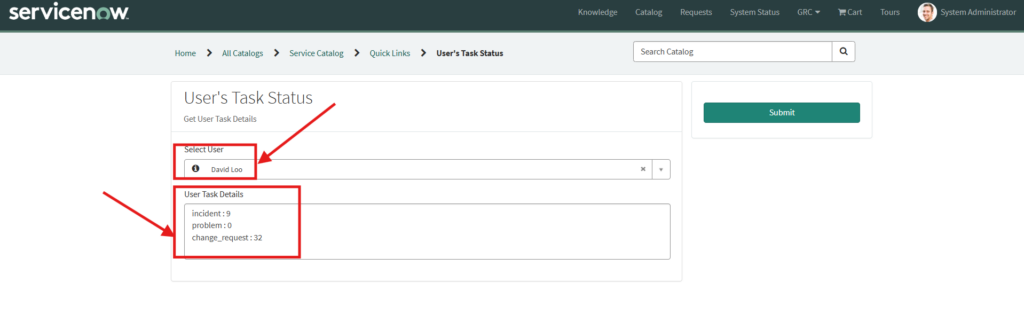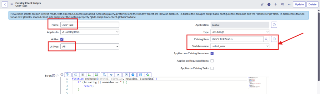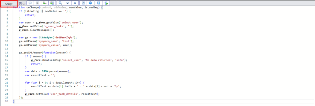 This script will get the value of the user from the catalog item. Also, once we select the user on catalog item, it will fetch the assignment details and that details will be populated in the ‘User Task Details’ field.