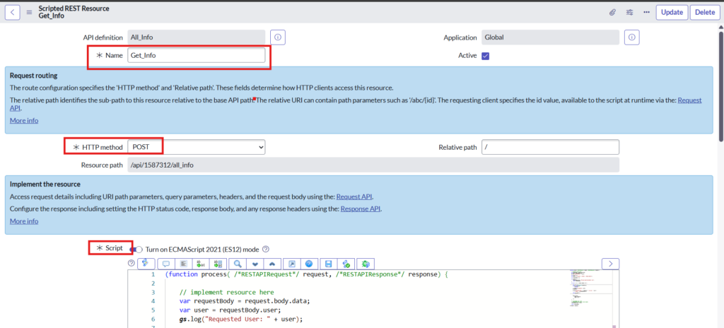 Give a name to new Scripted REST API and fill the mandatory fields as below: