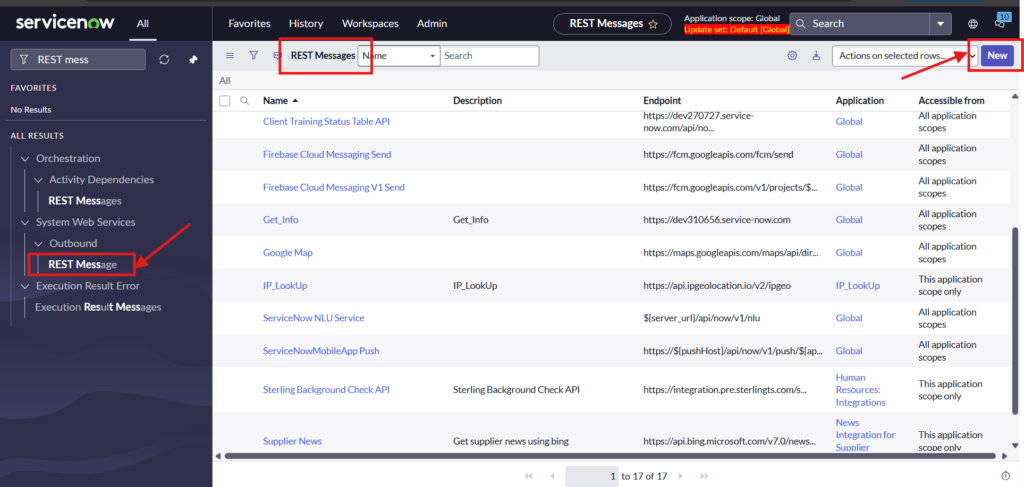 Navigate to ALL > System Web Services > Outbound > REST Message > New